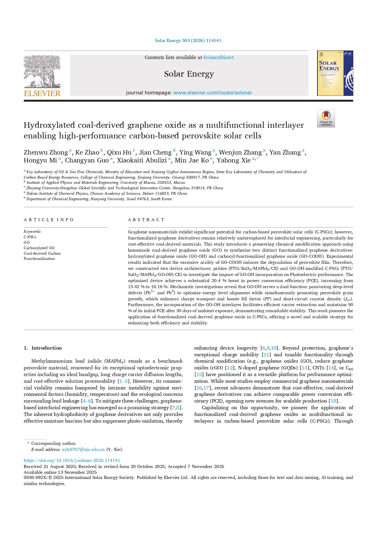 [Prof. Min Jae Ko] Hydroxylated coal-derived graphene oxide as a multifunctional...