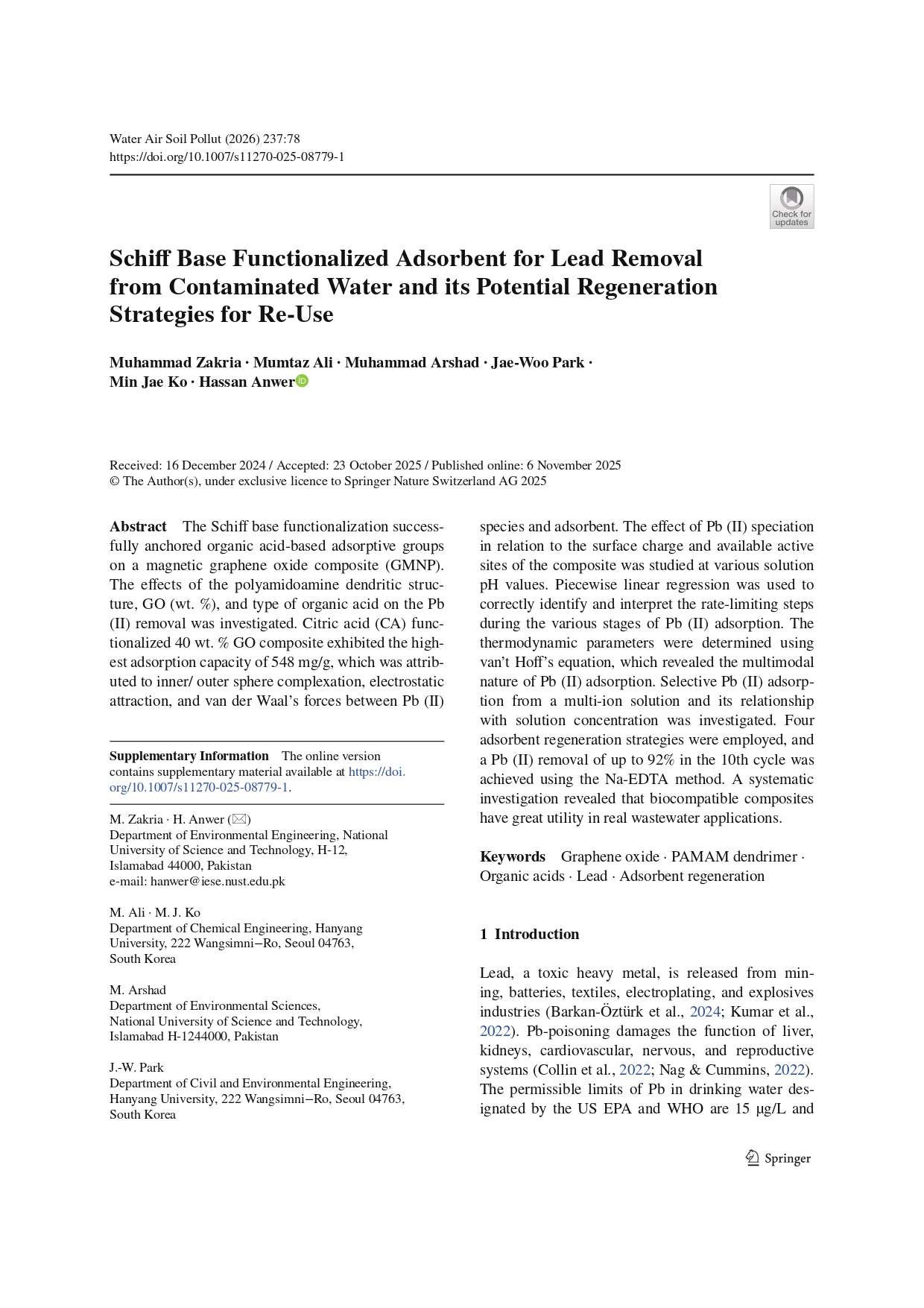 [고민재교수 연구실] Schiff Base Functionalized Adsorbent for Lead Removal from ...