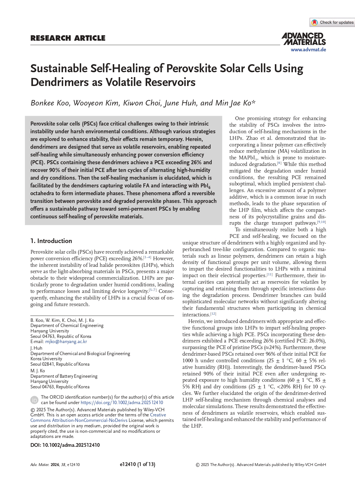 [고민재교수 연구실] Sustainable Self-Healing of Perovskite Solar Cells Using De...