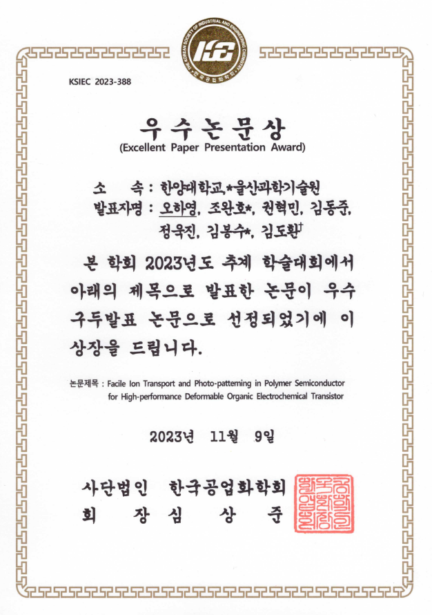 [김도환교수 연구실] 오하영 석박통합과정생_2023 KSIEC Fall Meeting_우수 구두 발...