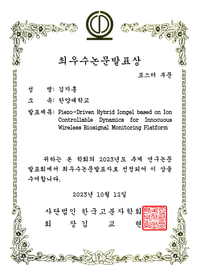 *발표제목 : Piezo-Driven Hybrid Iongel Based on Ion Controllable Dynamics for Innocuous Wireless Biosignal Monitoring Platform